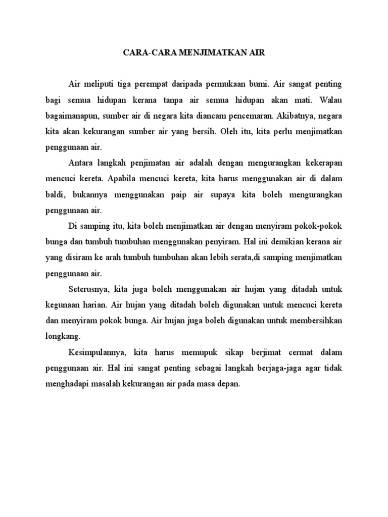 Manusia sangat bergantung kepada air untuk hidup. Air merupakan sumber daya alam yang sangat penting. Cikgu hailmi rabu, julai 24, 2013. Penjimatan air air bertindak sebagai salah satu keperluan utama untuk pertambahan dan pembangunan sejagat. F) kumpulkan air hujan untuk menyiram pokok dan tanaman.