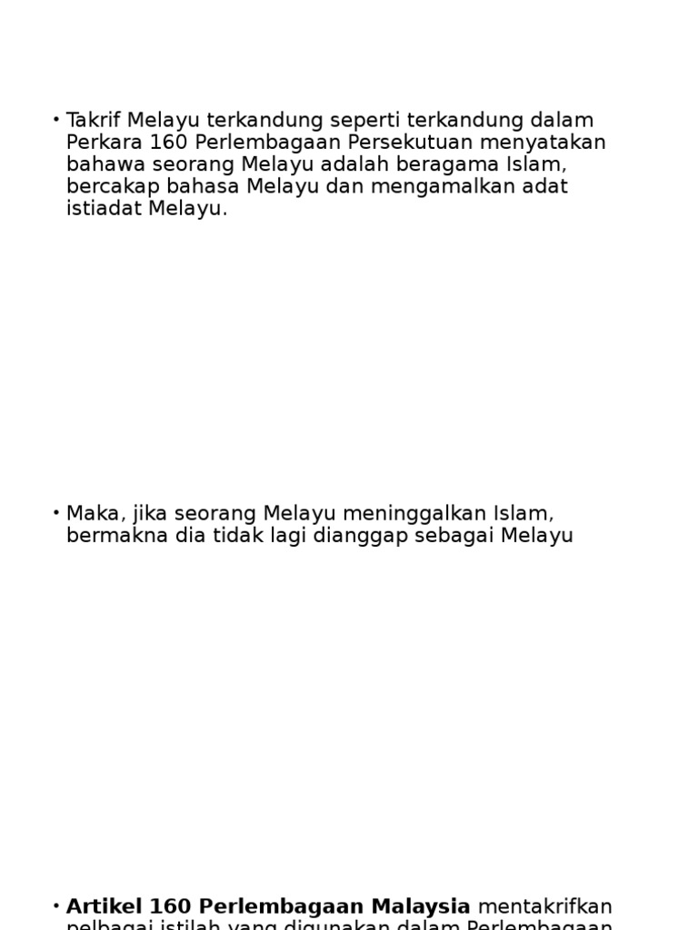 Rukun pembentukan masyarakat harmoni oleh: Secara cantuman wilayah hak istimewa orang melayu menurut perkara 160 (2) perlembagaan persekutuan malaysia, orang melayu ditakrifkan sebagai: Perlembagaan malaysia dikenali sebagai perlembagaan persekutuan. Perkara 160 (2) dalam perlembagaan persekutuan mentakrifkan melayu sebagai. Tetapi tidak hairanlah dalam perkara 160 perlembagaan malaysia, seorang melayu didefinisikan sebagai seseorang yang beragama islam, lazim bercakap bahasa melayu dan menurut adat istiadat melayu.