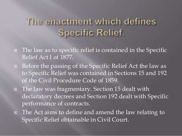 137 Specific Relief Act Pdf Free Download from docplayer.net This is a special act.though it has less sections but all are very effective. The amendment bill has changed the specific relief act, 1963 significantly. An act to define and amend the law relating to certain kinds of specific relief. Please fill this form, we will try to respond as soon as possible. Consensual obligation is when a person agrees to. Reliefs regarding possession of movable and immovable property · immovable property · movable property. With the act permitting a dispossessed person, and any person claiming through such dispossessed person, to file a suit for recovery of possession of immovable property, the bill additionally allows a person through whom the. Start studying specific relief act.