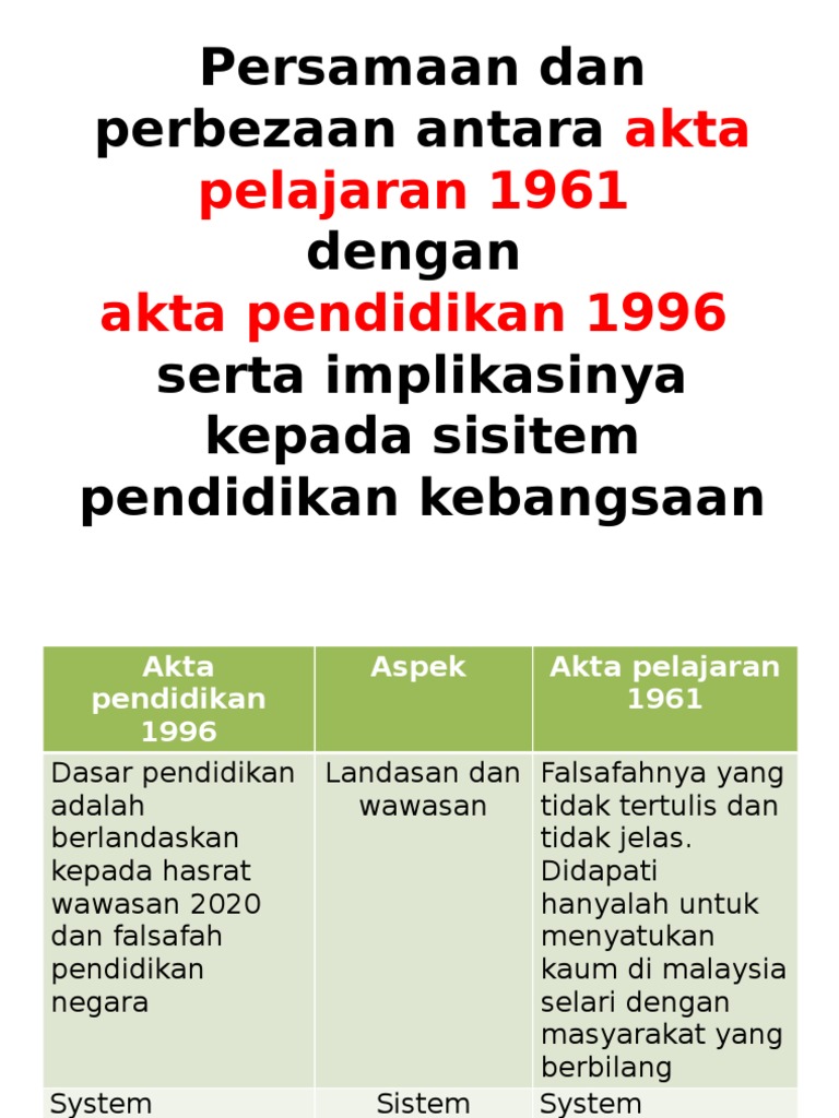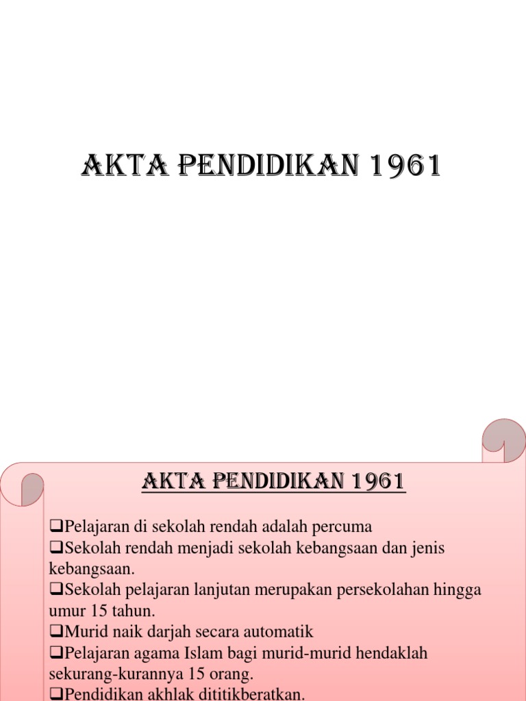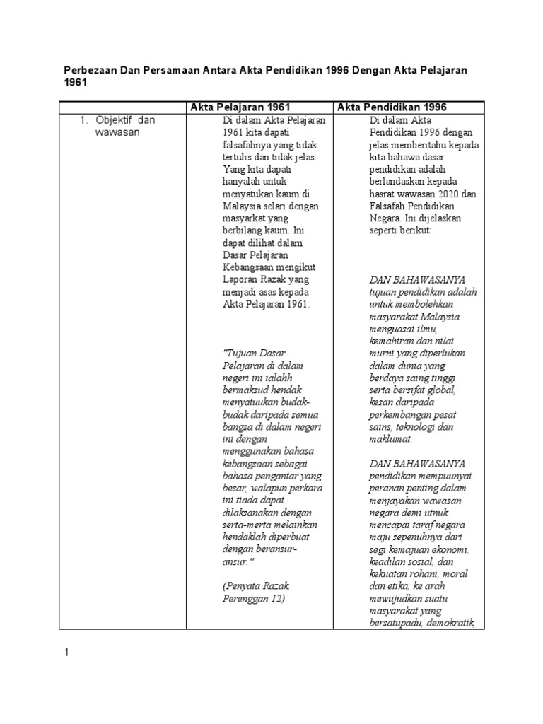 Kemudian, sebuah jawatankuasa kabinet telah ditubuhkan dalam tahun 1974 untuk mengkaji semula dasar pendidikan. Klik sini untuk muat turun perbandingan akta pendidikan 1996 dengan akta pelajaran 1961. Persamaan akta pendidikan 1996 dan akta pelajaran 1961. Dalam bahagian 1 (tafsiran) akta ini dinyatakan bahawa sekolah pendidikan khas menyediakan layanan pendidikan. Apatah lagi bermula 1962, kerajaan telah.